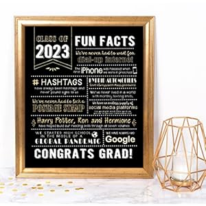 Katie Doodle – 2023 Graduation Decorations – Class of 2023 Decorations – Great Party Centerpiece, Card or Class of 2023 Gifts for Her or Him – 2023 Fun Facts Sign [Unframed], 8×10 inch, Black and Gold