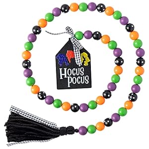 HALLOWEEN CLASSIC DESIGN -- Our Hocus Pocus wooden bead garland has a strong Halloween style, design with the most classic color of Halloween. One end of the wooden bead is a combination of hocus pocus tag and lattice bow, and the other end is decorated with cotton rope tassels and lattice braid. It is very special. When it is hung on the fireplace or decorated on a tray, it can add luster and strong Halloween atmosphere to your house.