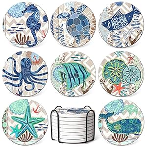 Coaster for Drinks by Teivio, Absorbing Stone Sea Ocean Life Paint- Cork Base, with Holder, Coastal Decor Beach Themed Tropical , for Housewarming Bar Decor, Set of 8