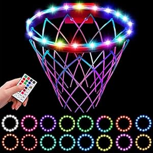 【Change Color with Remote Control】 The remote control control distance in 16 FT, can change the basketball hoop lights rim color as you like. 16 color change (red, blue, green, pink, multi-color, etc.), 7 lighting flicker modes(FADE, JUMP, ASYN FADE, ASYN JUMP, IN WAVES, STROBE TWINKLE), 4 timer (4H, 6H, 8H, 24H). Makes your kids twilight a little more fun.