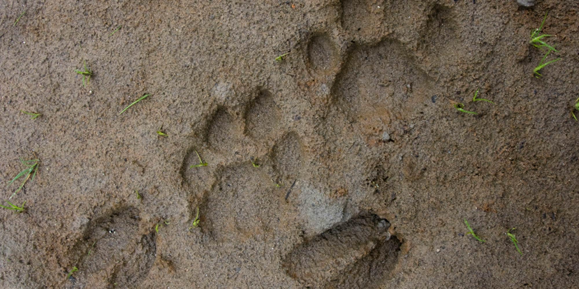 3. A bullfrog. These unique tracks reveal all four feet of a frog. The top two tracks are the frog’s front feet, which have four clawed toes that face inward. The hind feet (bottom) are significantly larger than the front with five clawed toes. Most of the time, only the toes of the frog’s hind feet register in tracks. Frogs come in all sizes. The track pattern of a large bullfrog track like this one measures about 4 inches wide.
