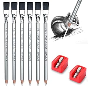 KALOUR Detail Eraser Pencil – 6pc Eraser Pencils with Brush and 2pc Sharpener,Erasing Small Details or add Highlights for Sketching, Charcoal Drawings. Fine Detail Eraser for Beginners & Artists