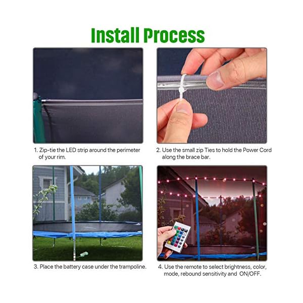 【Easy to Install】The Flexible strip light permits you to bend or shape freely, simply tie the LED strip around the perimeter of your rim with the zip ties. Then Place the battery case under the Trampoline and use the remote to make a choice brightness, color, mode, rebound sensitivity and ON/OFF.