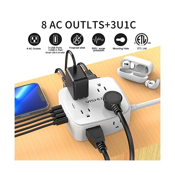 【4+4 Outlets Power Strip with 4 USB Ports】- The 3-side power strip with 8AC widely outlets and 4 USB charging ports total 4.2A, every USB A port features 5V/2.4A Max output. USB C charging port features 5V/3A MAX. can power up to 12 devices concurrently.Wide range voltage design, can be utilized on 120v to 240v circuit