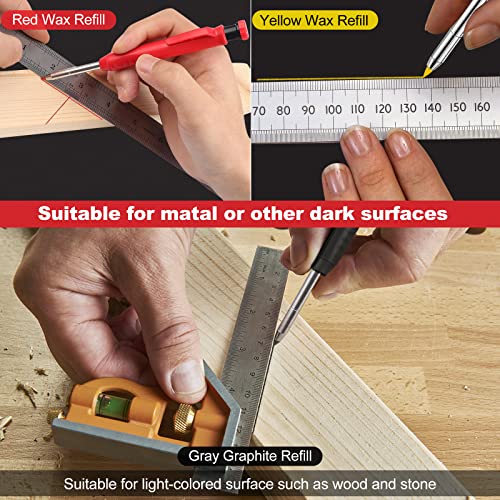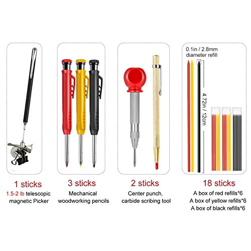 【Mechanical Carpenter Pencils kit】: Package Included 3 pcs solid mechanical carpenter pencil with 21 pcs marker refills, 1 piece carbide scriber tool ,1 piece automatic center punch tool and 1piece Magnetic PickUp Tool, Multiple tools can meet your different woodworking marking needs.