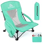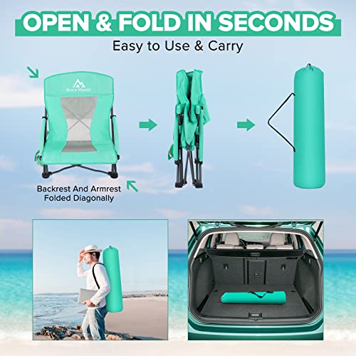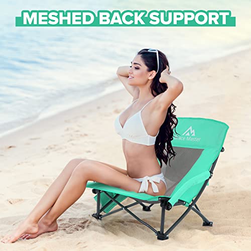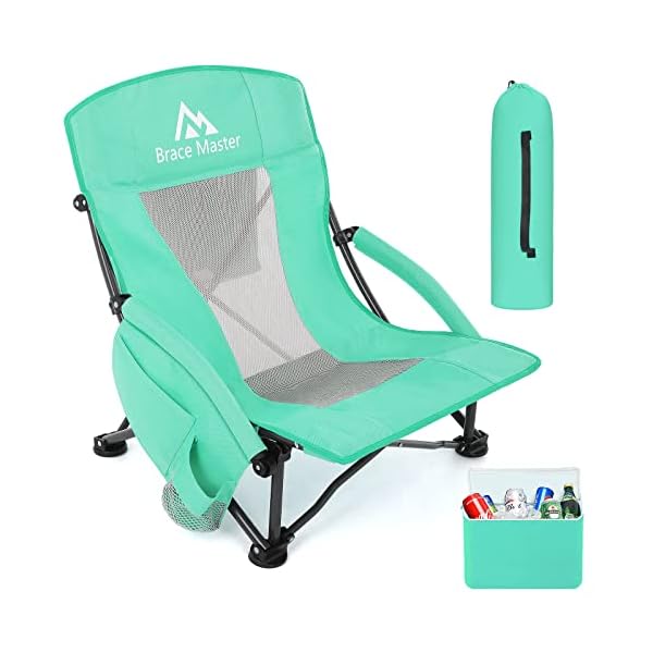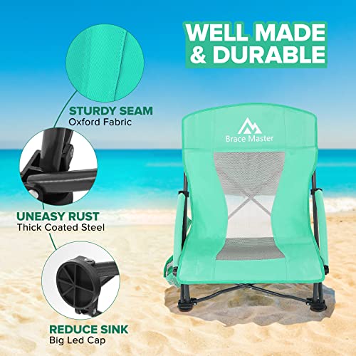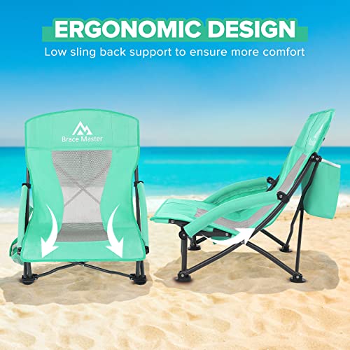 Brace Master Beach Chair Camping Chair,Low Back Sand Chairs,Foldable Mesh Back Design with Cup Holder & Cooler & Phone Bag,for Camping,Beach,Picnic(Green 1 Pack)