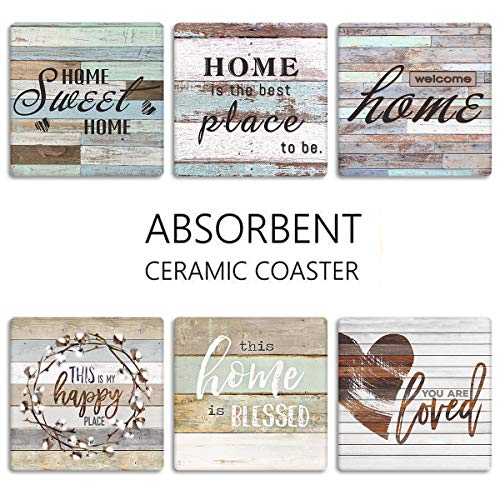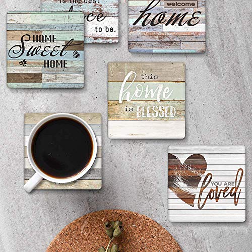 Britimes Set of 6 Coaster for Drinks Absorbent with Cork Base, Metal Holder, Square Stone Drink Mat for Coffee Wood Table, Gift for Birthday, Rustic Farmhouse Housewarming Room Bar Decor Worn Wood