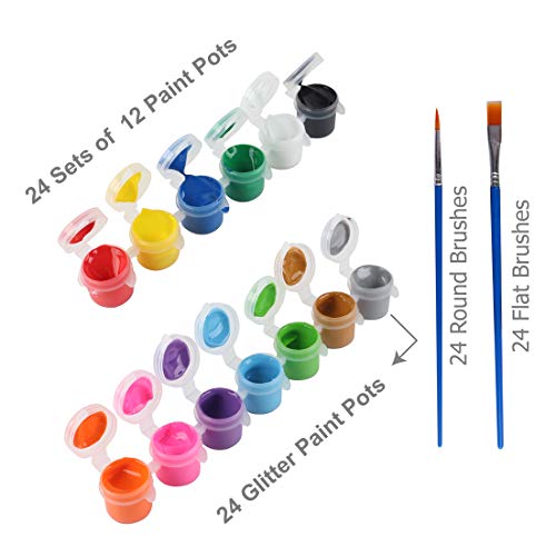 COMPLETE SET – Each of the 24 sets comes with 6 primary paint colors, 6 bright and exciting neon colors, 1 silver glitter paint, a flat brush for large surfaces, and a round pointed brush for details. For this child friendly set, we chose extra bright and popping versions of each color to add excitement and fun to their project. Each paint pot is 5 ml, for a total of about 65 ml of paint per set!