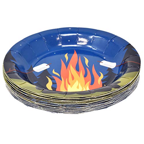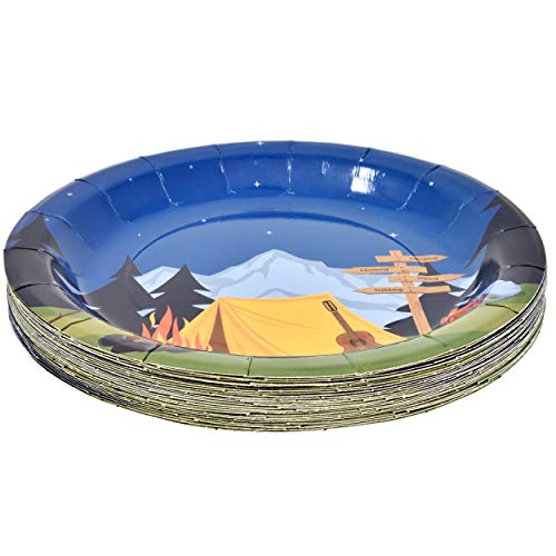 Camping Adventure Set Serves 24: Gift Boutique camping party set includes 24 9” Dinner Plates featuring a bonfire with marshmallow roasting sticks under a starlit blue sky and trees with 50 Luncheon Napkins coordinating. 24 7” Dessert Plates is designed with a camping tent camp fire marshmallow roasting stick guitar camping backpack wooden directional sign under a starlit blue sky and trees with 24 9 oz. cups coordinating. High Quality: Plates are made of high quality thick paper. Napkins are soft and absorbent. Great for a Camp Out campsite party. Do NOT place the plates in the microwave. Cups are for cold drinks only. The campground party set really adds dimension to your parties as your guests will love the cute and pretty design. Enough For Your Guests: Stock up with this set of quality plates, cups and napkins to make sure you have enough for any for any meal around the campfire and those melted s’mores party or event. Serve dinner to guests in catering, buffet, potluck, events or daily meals. Suitable for adults, teens, boys and girls birthday parties, baby shower, picnic, camping trips, BBQ, and holiday celebrations. More Time to Enjoy: Disposable paper reduces clean-up time so you can enjoy more time with friends and family at a happy camper themed party. After the party just collect the tablecloths with all the garbage and throw it into the trash can. Presto! Cleanup completed! Dimensions: Dinner Plates measure 9” in diameter and Dessert Plates measure 7”. Cups are 9 oz. capacity. Napkins are 3-ply and measure 13” x 13” when unfolded and 6.5” x 6.5” when folded.