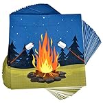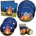 Camping Adventure Set Serves 24: Gift Boutique camping party set includes 24 9” Dinner Plates featuring a bonfire with marshmallow roasting sticks under a starlit blue sky and trees with 50 Luncheon Napkins coordinating. 24 7” Dessert Plates is designed with a camping tent camp fire marshmallow roasting stick guitar camping backpack wooden directional sign under a starlit blue sky and trees with 24 9 oz. cups coordinating.