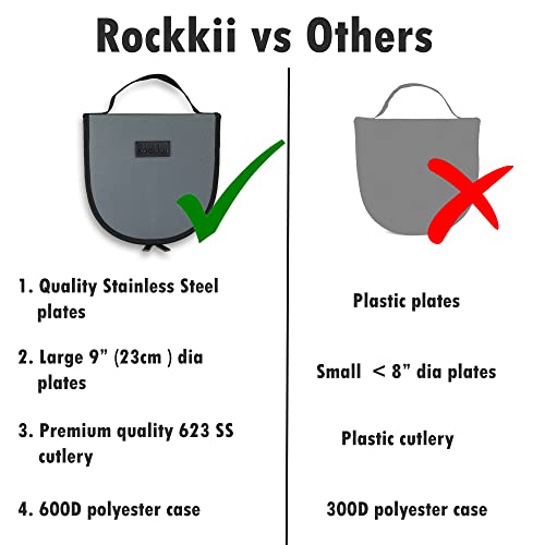PREMIUM QUALITY: This 11-pc mess kit is made of premium food grade stainless steel. Rust-resistant, sturdy and durable. This set includes 2 SS plates, 2 SS forks, 2 SS spoons, 2 SS knives, 1 bottle opener, and 2 table napkins.