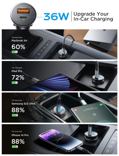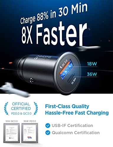 ⚡54W EFFICIENT QUICK CHARGING: AINOPE 54W fast USB C car charger supporting PD 36W(Max) and QC 18W(Max) high output, can fast charge all prevailing phones at the same time. The PD port, 8X faster than 2.4A charger, can fast charge Macbook Air, iPad Pro 11 12.9 inch, Samsung Galaxy S23 S22 S21 Note 20 Ultra Z Flip 3 Fold 4, iPhone 14 Pro max 13 12 11 X XS XR 8 Plus SE, Pixel 3 3a XL, etc.; Quick Charge 3.0 port, charges devices from 0% to 80% within 35 minutes.