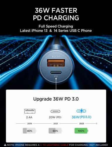 ⚡FAST CHARGER TWO DEVICES SIMULTANEOUSLY: Equipped with USB A(QC3.0) port and USB C(PD3.0) port, AINOPE cigarette lighter usb charger can charge two devices concurrently, no drop in power even if concurrently fast charging as its indepent PD&QC3.0 protocol chip. (❤️TIPS: IPHONE REQUIRES A LIGHTNING TO C CABLE FOR CHARGING(NOT INCLUDED!!!).