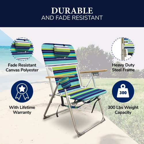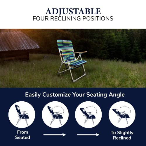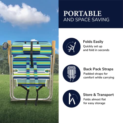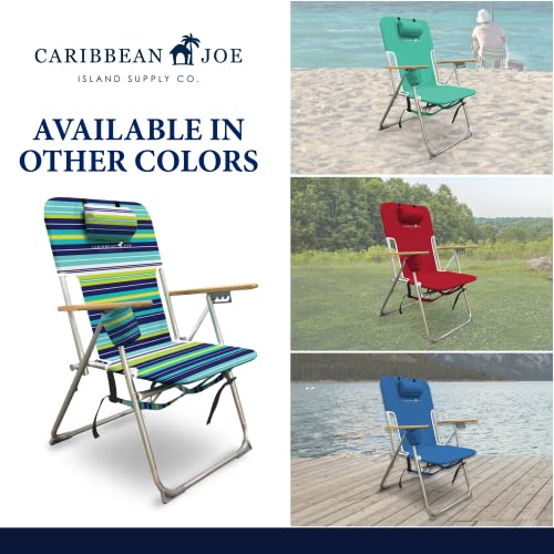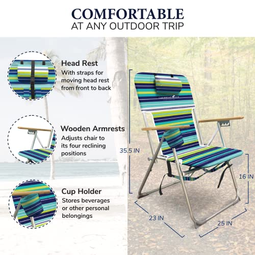 Caribbean Joe Folding Beach Chair, 4 Position Portable Backpack Foldable Camping Chair with Headrest, Cup Holder, and Wooden Armrests, Blue and Lime Stripe