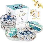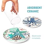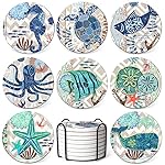 Coaster for Drinks by Teivio, Absorbing Stone Sea Ocean Life Paint- Cork Base, with Holder, Coastal Decor Beach Themed Tropical , for Housewarming Bar Decor, Set of 8