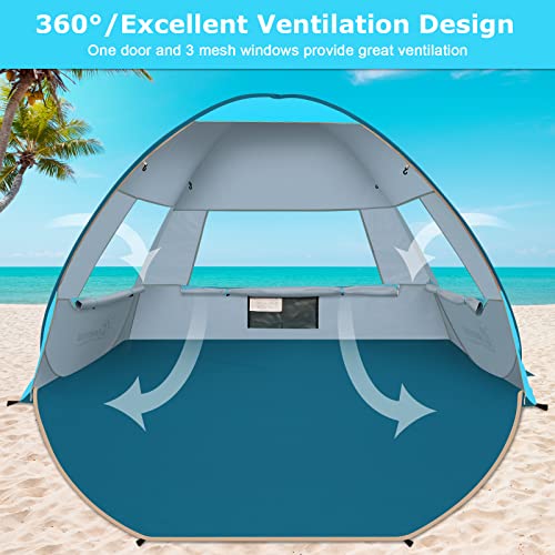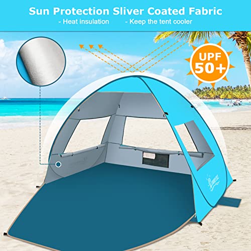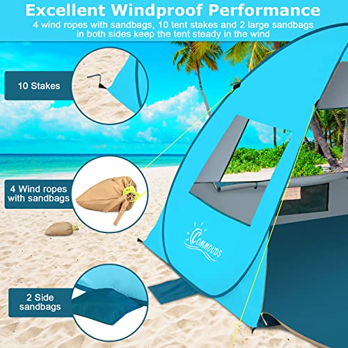 COMMOUDS Large Pop Up Beach Tent for 3-4 Person, UPF 50+ Beach Sun Shade, Automatic Beach Sun Shelter Umbrella with Carry Bag, Lightweight and Easy Set Up
