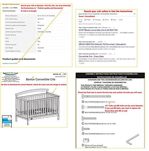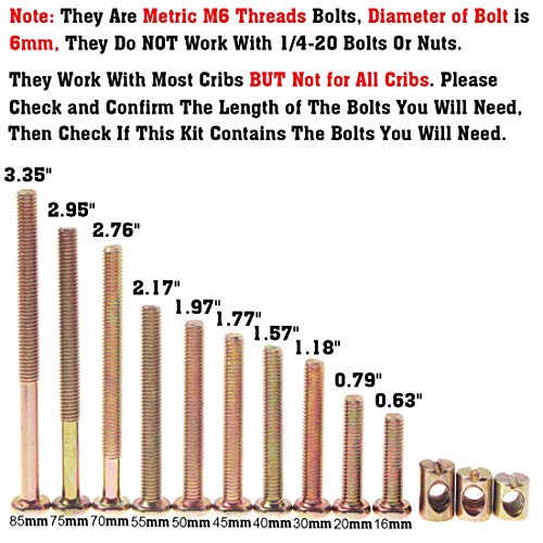 This Baby Bed Crib Screws Bolts Hardware Kit includes M6 x 16mm 20mm 30mm 40mm 45mm 50mm 55mm 70mm 75mm 85mm bolts and barrel nut (9.8mm x 11mm 12.5mm 14.5mm), 10 sizes bolts and 3 sizes barrel nuts, they fit most cribs, beds, tables, chairs, or workbenches, DIY projects, etc.