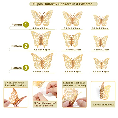Crosize 72 Pcs Gold Butterfly Decorations, 3 Sizes 4 Styles, 3D Butterfly Wall Decor, Butterfly Party Decorations, Birthday Decorations, Butterflies for Crafts, Cake Decorating, Wall Stickers Room Decor for Baby Shower Girls Kids