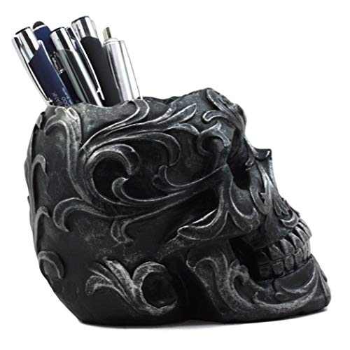 Ebros Gift Tribal Tattoo Floral Skull Pen Holder Figurine 5.75″L Office Desktop Ossuary Skulls Decor Cranium Skeleton Head Stationery Holder As Halloween Macabre Graveyard Spooky Decorative Statue