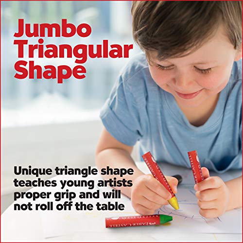 TRIANGULAR SHAPED – Faber-Castell jumbo crayons are triangular in shape allowing for young artists to learn proper grip and prevent hand fatigue when coloring. Bonus – these triangular crayons will not roll off your school desk or workspace!