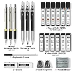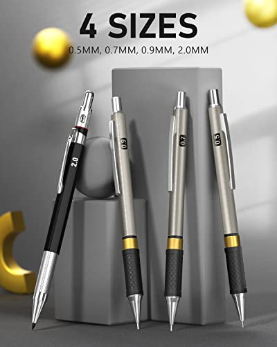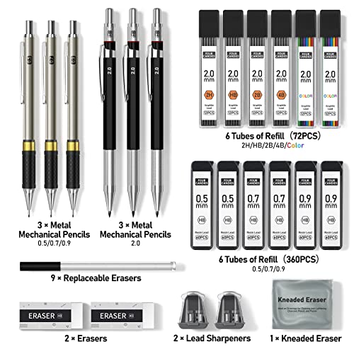 FourCandies 25PCS Art Mechanical Pencil Set with Case, 3PCS Metal Artist Lead Pencil 0.5, 0.7, 0.9 mm & 3PCS 2mm Lead Holder(HB 2H 2B 4B Color) with 432PCS Graphite Lead Refills for Drawing Sketching