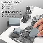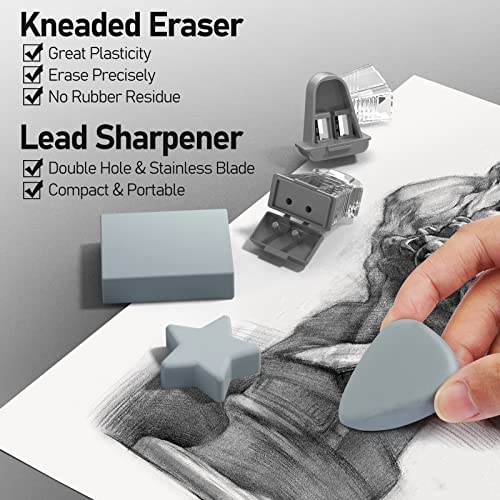【Kneaded Eraser&Sharpener】Includes a kneaded eraser and a sharpener built into the cap of a 2.0mm lead holder, Two extra lead sharpeners are provided for 2.0mm results in keep them fine when they turn out to be dull. The kneaded eraser is ideal for cleaning and blending charcoal, pencils in drawings.