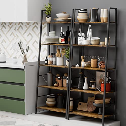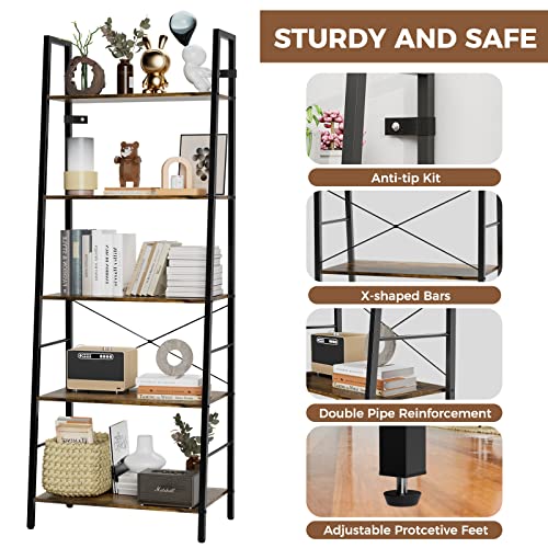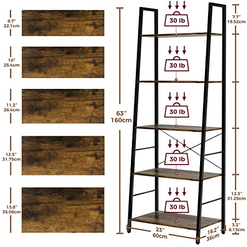 Gadroad Ladder Bookshelf, Industrial 5-Tier Bookcase,Free Standing Ladder Shelf, Utility Organizer Shelves for Plant Flower,Wood Look Accent Furniture with Metal Frame for Home Office,Rustic Brown