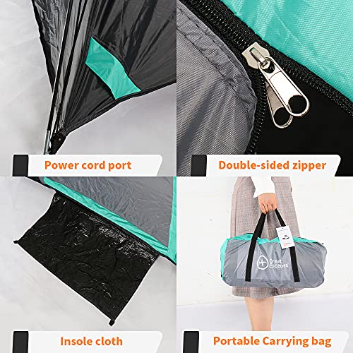 Good Air Permeability: The size of the tent is 82.68*59.06*43.31 inches, and the space is spacious enough to accommodate 2 people. The outer tent adopts a canopy and draped structure, which has better air permeability. A D-shaped door in the front of the inner tent and a semi-circular window at the back make the air convection effect better.