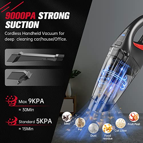 ✅ NEWLY UPGRADED 9KPA STRONG SUCTION POWER: The upgraded cordless handheld vacuum provides up to 9kPa strong cyclonic suction power, which is twice as strong as the average handheld vacuum cleaner. Two suction modes can be freely switched: 9kPa/5kPa for cleaning dust, crumbs and pet hair in cars, sofas, walls, stairs and other hard-to-reach places.
