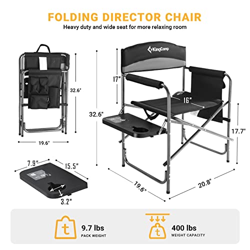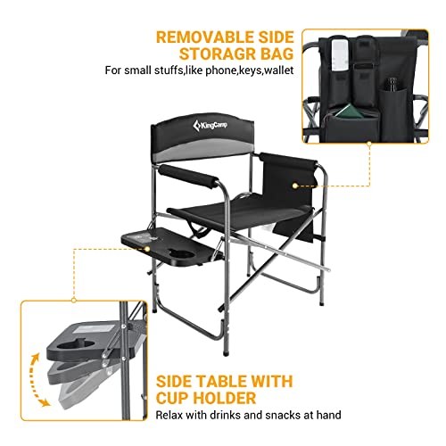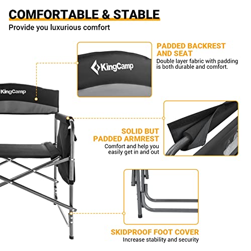 KingCamp Camping Directors Chair Outdoor Folding Lawn Chair for Outside Camp Portable Chair for Adults Heavy Duty 2 Pack with Side Table and Side Pockets Supports 400lbs(Black/Medium Grey)