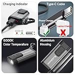 Robust Design and Secure Protection: Top of the range aluminum housing and key ring, Safety mode button (double press-UV, long press-white), durable USB-C charging port.