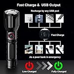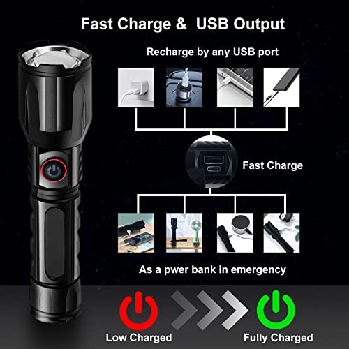 ✅【Fast Charging Power Display & High-quality materials 】Type-C charging with bonus Power Bank function, When the red light is displayed, please charge it in time.IPX5 waterproof & Shockproof, have an effect on resistance. Perfect for the usage of in the rainning, snowing or other emergency situation. This super bright flashlight is made of high-quality aviation aluminum for excellent heat dissipation.