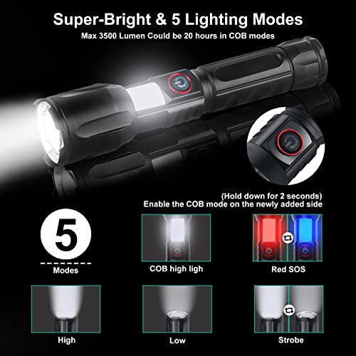 ✅【Zoomable & 5 Lighting Modes】The powerful handheld flashlight has 5 lighting modes. The main LED provides 3 modes: high-low-strobe, (Press and hold for 3 seconds) the newly added side COB provides 2 modes: white high – red SOS. According to your needs and the environment you are, you can stretch the head to adjust the beams -spotlight or floodlight, keep it at hand or place at the desk or ground. Widely used for camping, hiking, fishing, dog walking, work etc