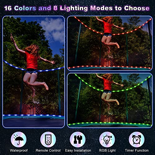 Wireless Remote Keep watch over: experience the beautiful lighting with these wireless remote controlled trampoline fairy lights; With up to 16 colors to make a choice from and 8 dynamic light modes, including flashing, waves, combination, sequential, slow glow, chasing, slow fade, and steady on, you’ll be able to create a fun and vibrant atmosphere for your kids to enjoy