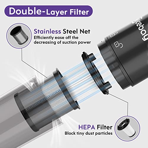 💜 【Double-layer Filter System & Washable Filter】: This handheld vacuum cleaner has a three stage filtration system of HEPA filter and stainless steel filter, can filter 99.99% of the dust. oth the filter screen and the dust container are washable and durable, it can be easily removed and cleaned. And thoughtful for you to prepare a replacement filter in the package.