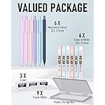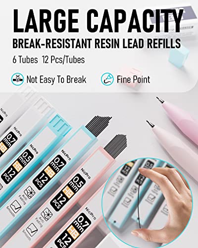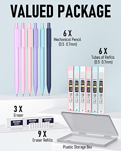 Nicpro 6PCS Pastel Mechanical Pencil Set, Mechanical Pencils 0.5 & 0.7 mm with 6 Tubes HB Lead Refill, 3PCS Eraser and 9PCS Eraser Refill for Student Writing Drafing, Drawing, Sketching-with Cute Case