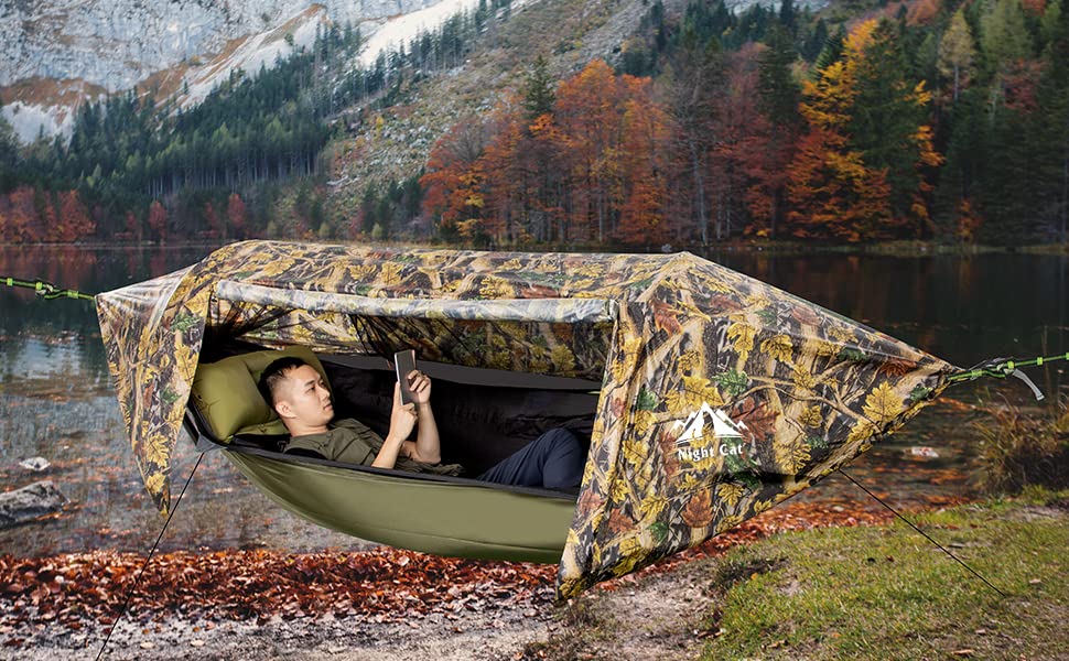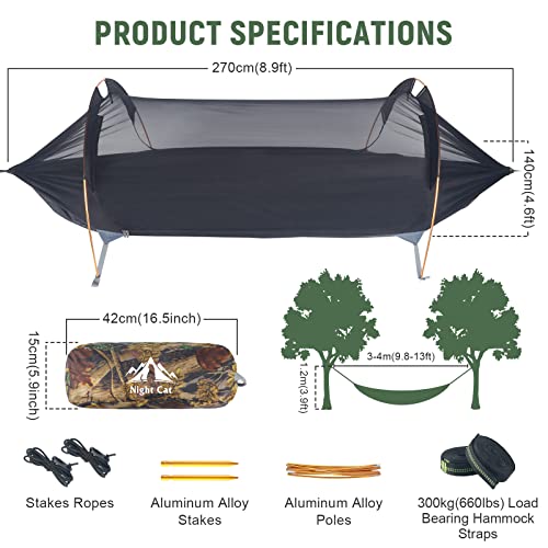 Night Cat Camping Hammock Tent with Mosquito Net and Rain Fly 1-2 Persons Backpacking Bivvy Ground Tent with Tree Strap Swing Heavy Rain Waterproof Lightweight 440lbs