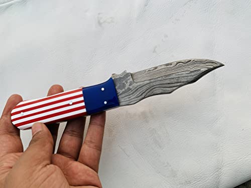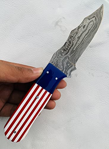 NUSHBA 011 Handmade Knives Damascus Steel Hunting Knife 8 Inches and USA flag Raisin Sheet Handle with Cow Brown Leather Sheath