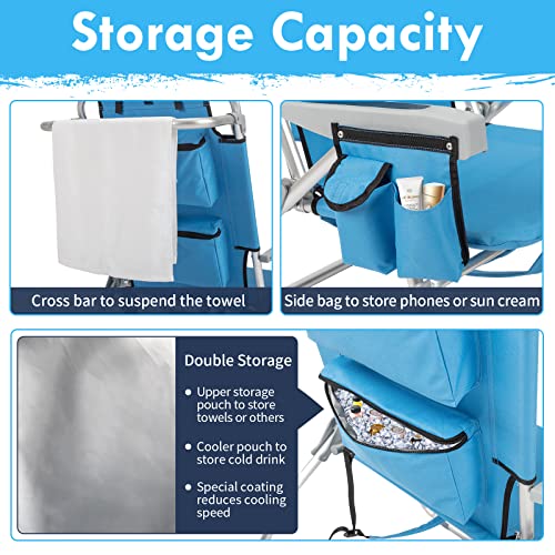 【STRONG STORAGE】Side bags to store phones, sunglass or sunscreen scream. Two storage bags in the back of beach chair are different. Upper storage pouch to store towels or others. Cooler pouch to store cold drink. Cross bar to suspend clothes