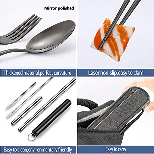 《Multi-function combination》Shuttle Black Silverware set with case- includes knife,a special included sheathed steak knife,fork,spoon with Shuttle chopsticks, easy-carry zipper-bag.two mini spice jars and a portable straw set ( a telescopic straw and a telescopic straw brush.).