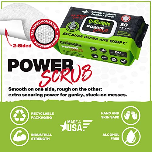 PowerScrub by Crocodile Cloth – 80 Textured Cloths, 10in X 15in. Large, Moist, Absorbent & Disposable Cleaning Cloths. Safe on Skin and Multiple Surfaces – Tools, Wood, Plastic, Metals