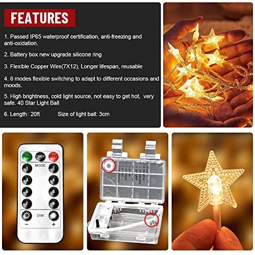 【Newly Upgraded Waterproof String Light】The star string lights is IP65 waterproof and can be utilized Out of doors and indoor without any worry of moisture or weather damage or short circuit. There is silicone seal around the battery box which greatly improved waterproof. Ideal for Out of doors Party or Camping.