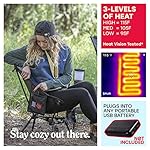 The Original Hot Seat: World’s first heated compact portable outdoor chair! Enjoy heated comfort and relief everywhere you go! First, plug into any standard USB battery pack (not included). Then, select from three three heat settings and enjoy up to 115 degrees of luxurious cozy warmth. NOTE: THE 6 INCH BY 10 INCH HEATING PAD IS POSITIONED IN THE SEAT AND LOWER BACK OF THE CHAIR ONLY.