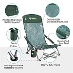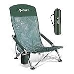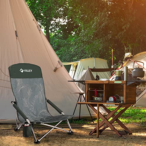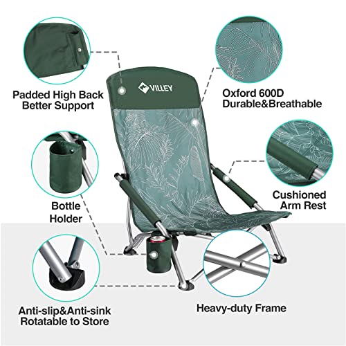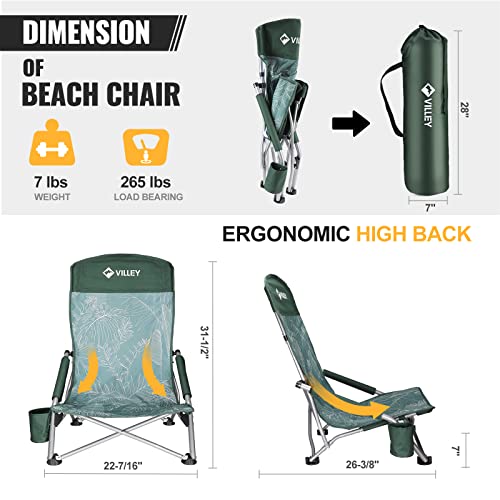 VILLEY Low Beach Chair, High Back Folding Beach Chair for Adults, Lightweight and Portable for Outdoor, Beach, Camping, Lawn, Music Festival, with Cup Holder and Carry Bag-Vintage Green Leaves