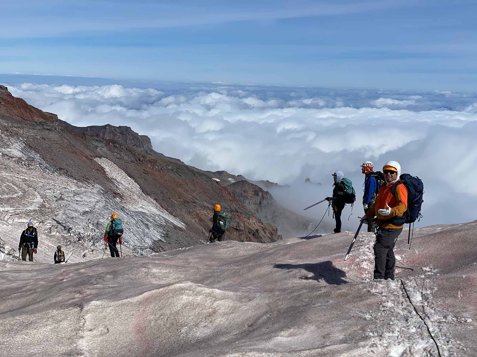 Heaton is now the leader of a group of six other climbers, representing a range of Indigenous identities, who have spent time training and preparing themselves to venture far up Tahoma as they can, quite possibly for the first time in recorded history. In early September of 2023, they reached 12,000 feet together, stopped short of summiting by deteriorating route conditions. But their mission is not simply to reach the top: They want to increase Native visibility on the mountain and raise awareness for the ancient relationship between Tahoma and the Indigenous peoples who honor her.